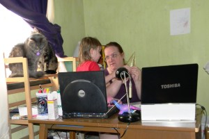 It’s noon.  The cats have found comfortable perches close by.  The dog and the 3yo have gone back downstairs.  Under the Radar sits open on the old laptop, currently at 83,693 words, and I’m guessing it will end up over 100.000 when it’s done.  I am now taking bets on how many words I’ll get done before midnight tonight.  I’ll keep you posted.