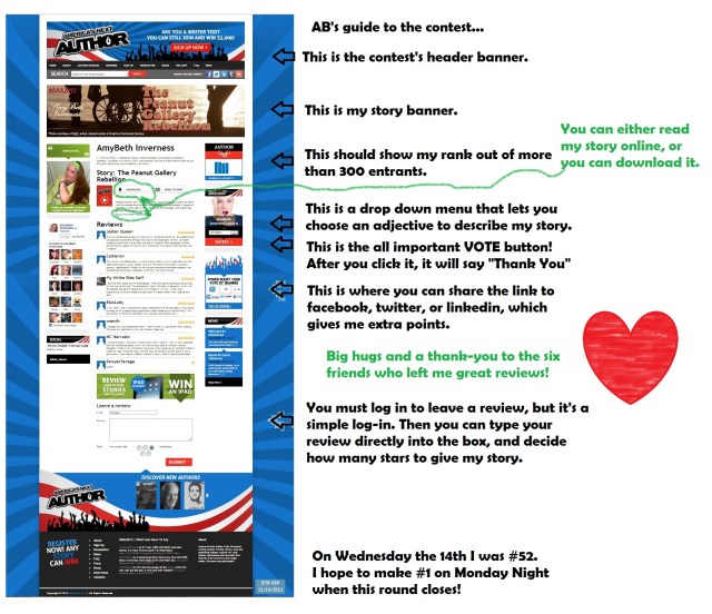 The other big thing going on is my entry in the America’s Next Author contest. This week I’m doing my big push for the contest. Please, pretty please with hot fudge on top, click the picture then click VOTE! It does not require a log-in, although you do have the choice to read and/or download my story, and you can select an adjective from the drop-down list to describe my story. There is also an area where readers can leave a review, which requires a simple log-in to the site. I would be extraordinarily grateful to anyone who left me a review!