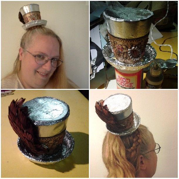 At some point in the last few years I decided I was a purveyor of aluminum foil hats. It began as a joke, as foil hats are one of the sillier affectations of eccentric SF writers… it gave me something to add to my twitter profile after “aspiring author.” It is SO much fun! Aluminum is very flexible and holds glue well. Since it is an innately silly project, I can go wherever I want with it.