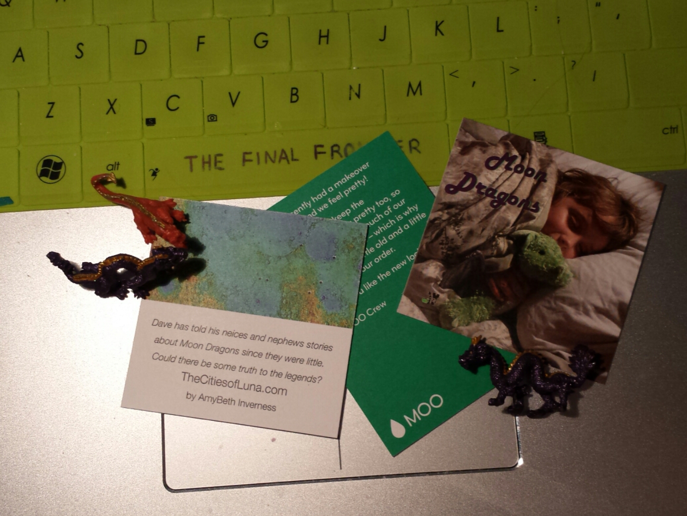 I have a couple of real, solid, non-book items that I plan to give away, which will cost me a little money for the swag and postage, so I will need to have some kind of wording that says “I have twelve of these” or something like that. The first and simplest is the square card you see above, with a tiny purple dragon attached to it. I plan to use these for something like “Post a picture of yourself with a dragon and I’ll send you one!” I’ll also have a separate thread just for “post your favorite dragon picture!” with no reward attached.