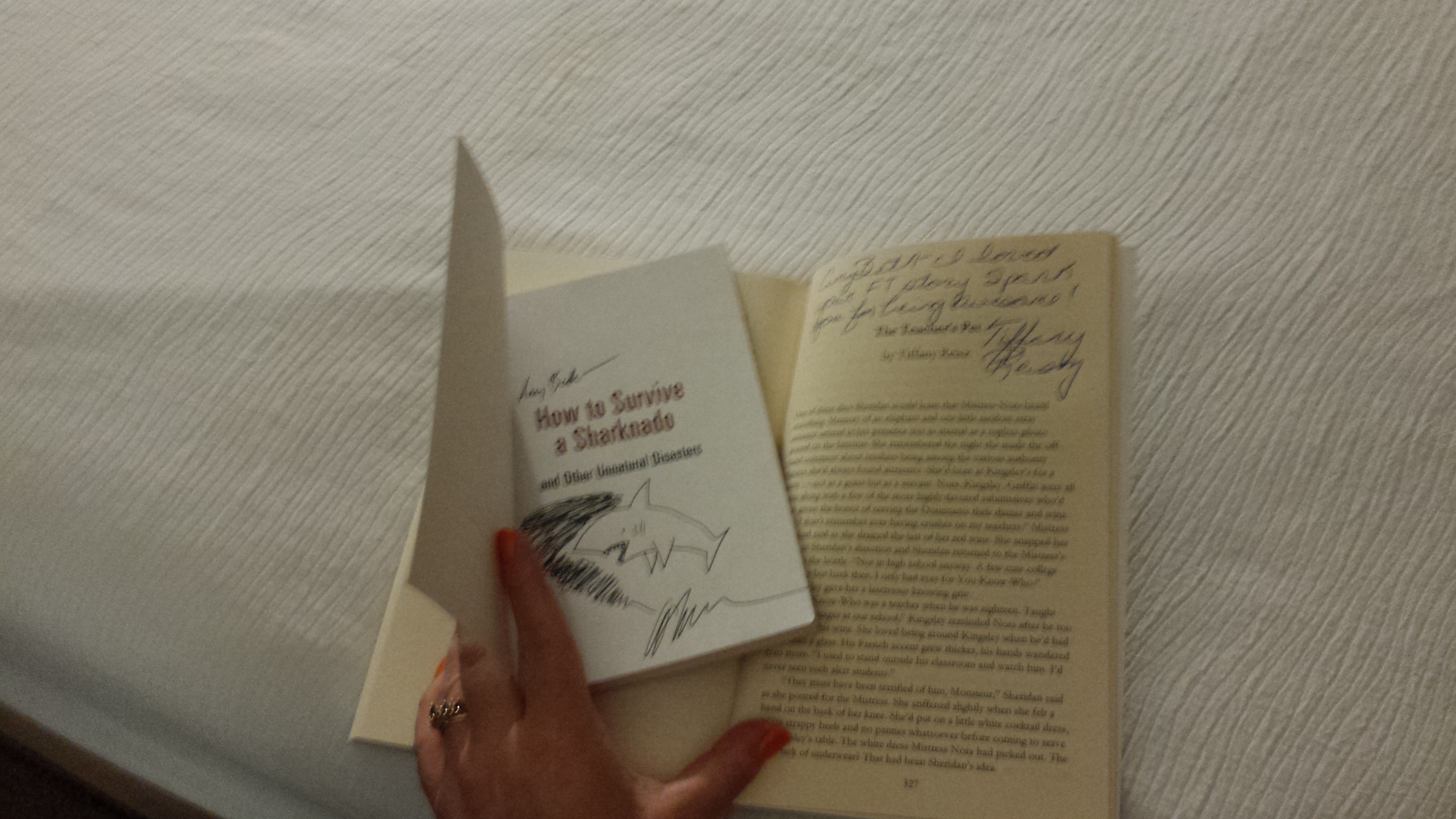 Reading 11This wasn’t a huge event. It was a reading and book-signing at an Indie bookstore. But that meant that I was able to sit up front and chat with Tiffany while Andrew was out buying her some mints. I even got a hug from each of them. After the readings, we were able to ask all the burning questions we’ve been too embarrassed to ask over twitter. (Although I did hear two women, walking out the door after the event, saying “You should have asked that question!” and the other protesting “No!” as if she was really embarrassed.)
